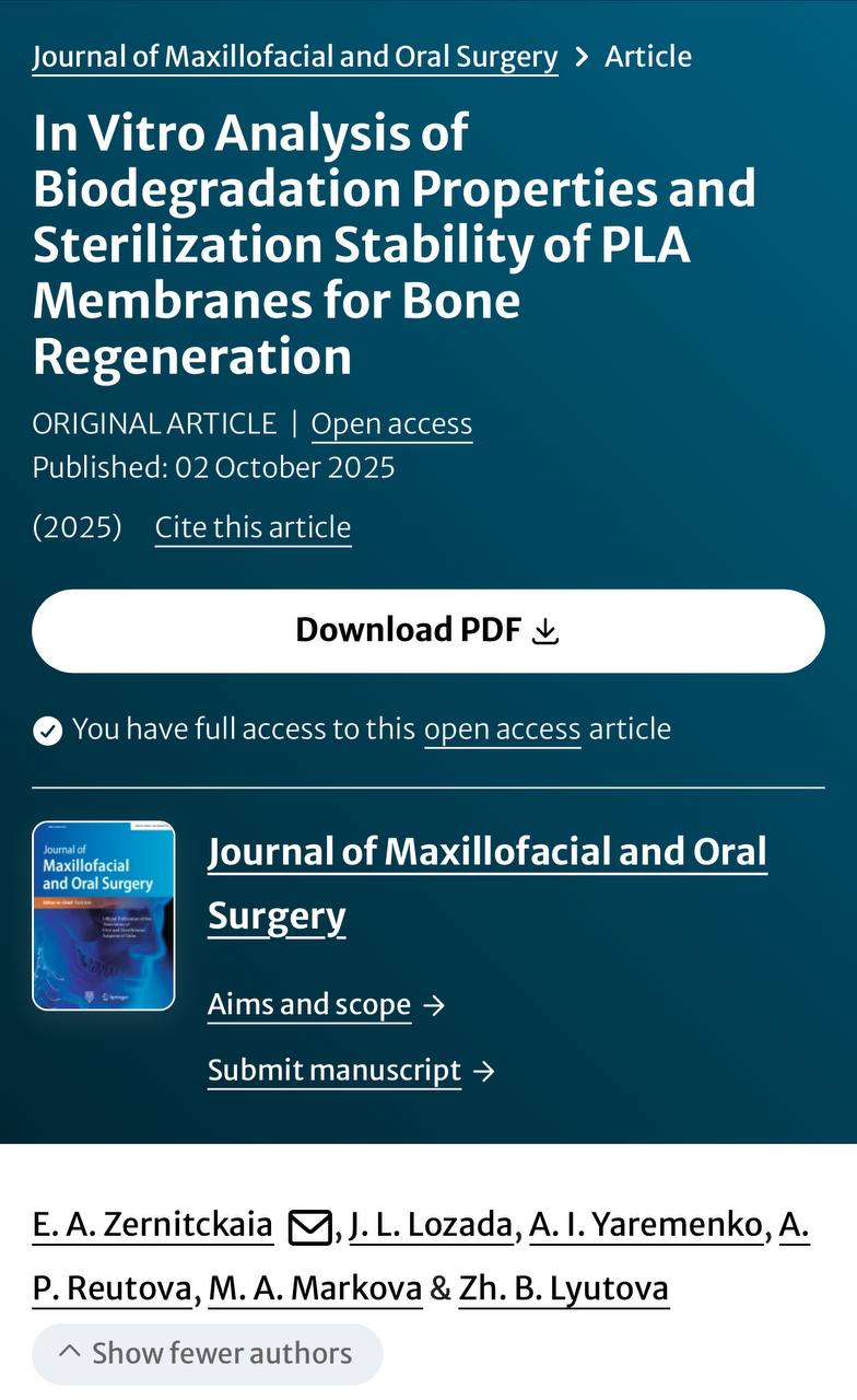 В работе мы исследовали свойства биодеградации и стабильность после стерилизации мембран на основе PLA, которые рассматриваются как перспективное направление для персонализированных решений в костной регенерации. Полученные результаты вносят вклад в развитие безопасных и эффективных биоматериалов, применимых в клинической практике и способных улучшить прогноз лечения пациентов в регенеративной хирургии.